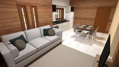 Com uma área privativa de 103,84m², possui um design moderno e espaçoso, ideal para famílias que valorizam o convívio e a harmonia. As esquadrias em madeira conferem um toque de elegância e aconchego ao ambiente, proporcionando uma atmosfera acolhedora e agradável. Forro À vista na sala e na cozinha, telha cerâmica, piso e azulejos retificados, pintura completa,
