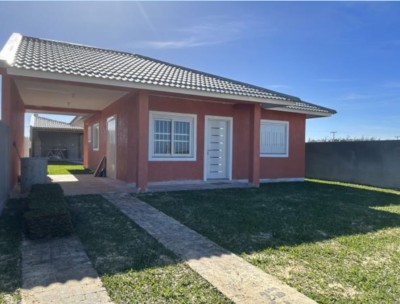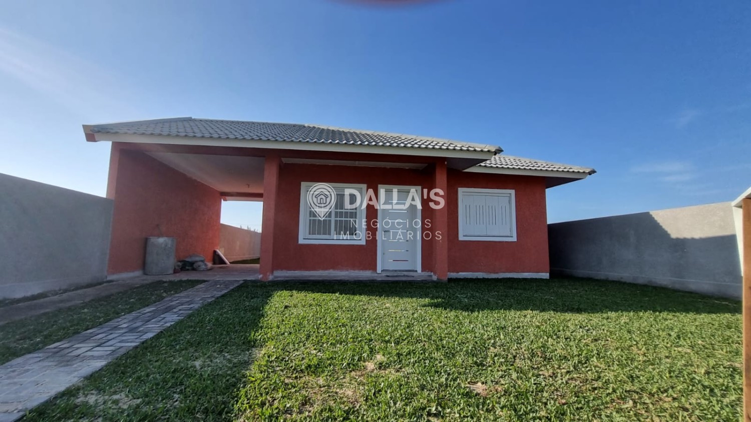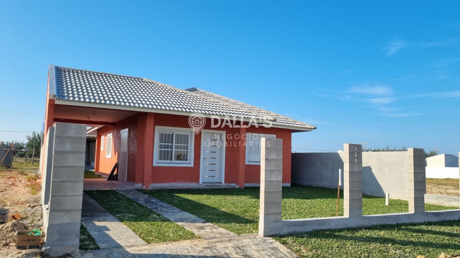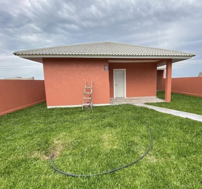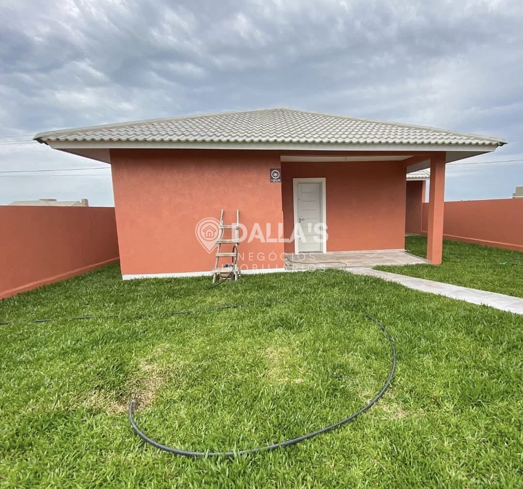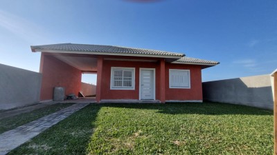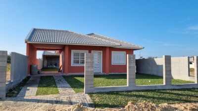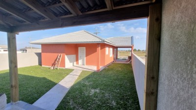Descrição › Casa nova em alvenaria no Loteamento Esmeralda a 400m do mar, orientação solar sul, 03 dormitórios (01 suíte), sala de estar/jantar, cozinha, banheiro social, área de serviço, abrigo coberto, quiosque com churrasqueira, forro de laje, telhas de concreto, aberturas e rodapés em madeira de Itaúba, piso porcelanato, cercamento em vidro, 125,03m² de área construída em terreno cercado de 12,00m x 30,00m (360,00m²), escriturada.