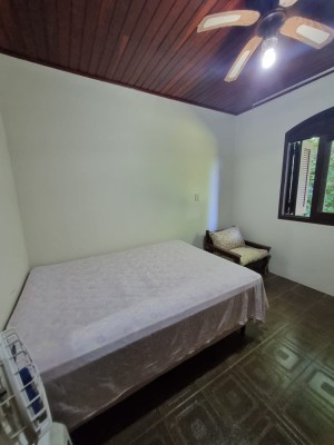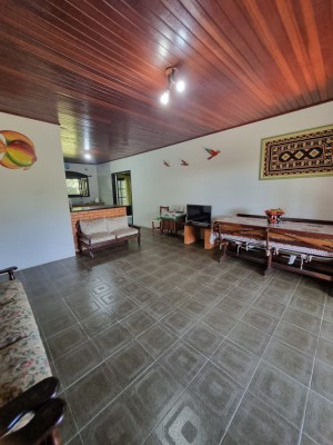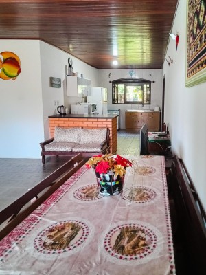 A casa em si se integra de forma harmoniosa com a natureza ao redor, com grandes janelas e varanda que permitem a entrada da luz natural.